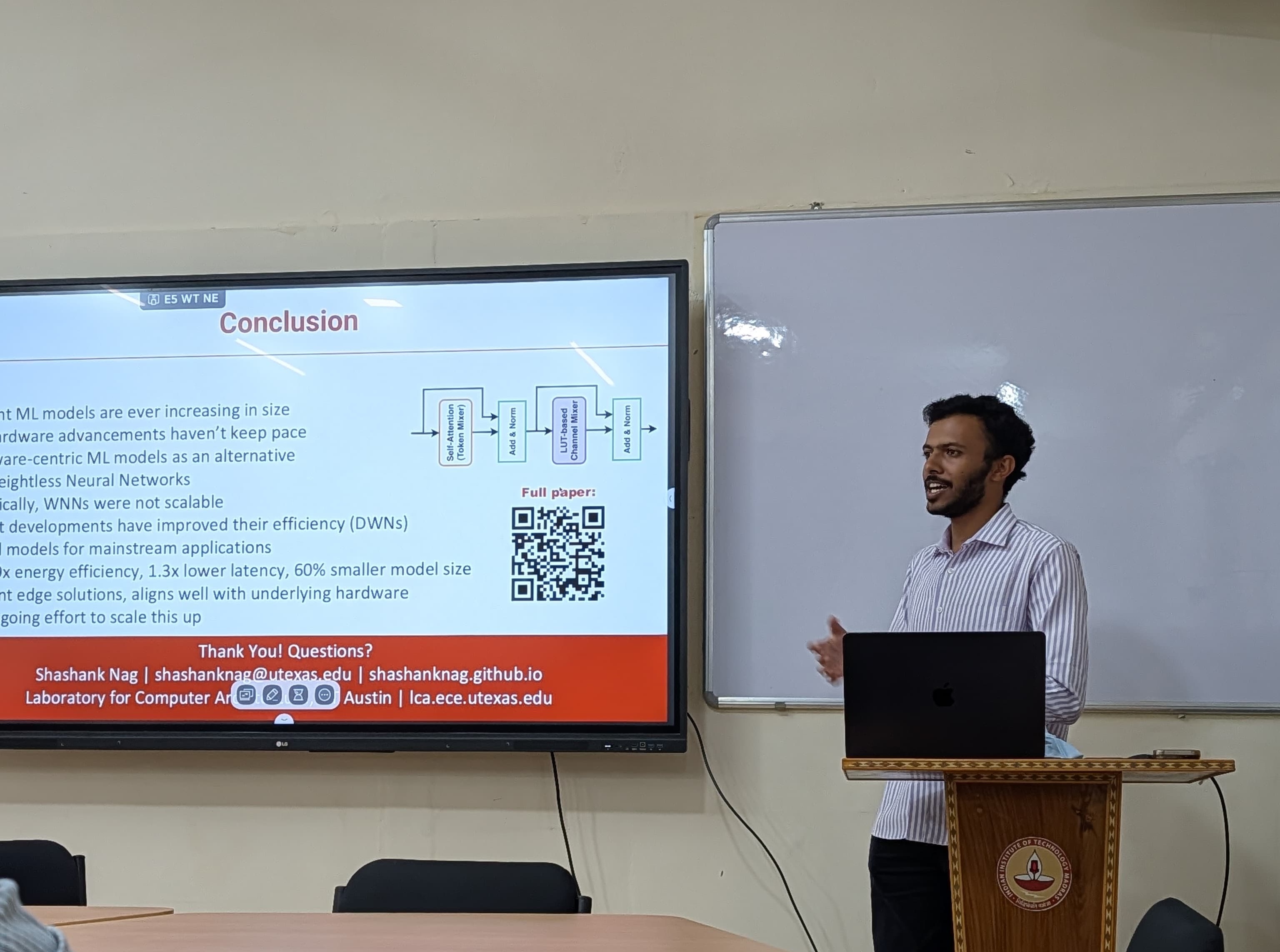 Abstract - Deploying fast, accurate, and efficient machine learning on edge devices remains a key research challenge. Deep Neural Networks (DNNs) have been traditionally popular, with wide ranging applications across domains. However, their computational and storage demands often hinder their deployment on edge devices that have stringent resource, latency, and energy budgets; with model quantization, pruning, and other such techniques being active areas of research to mitigate this. Weightless Neural Networks (WNNs), an unconventional class of look-up table based neural networks, offer an efficient alternative to DNNs. These networks eliminate most of the conventional model “weights”, and their architecture closely resembles the underlying logic fabric of hardware devices like FPGAs. However, these have been historically underutilized, and have been limited to relatively tiny models and simple applications. In this talk, I will present some of our recent research in the field of WNNs and their associated hardware accelerators, with an emphasis on our latest work (LL-ViT) that further extends these to the realm of vision transformers — making a case for mainstream adoption of these hardware-centric neural networks. Compared to their DNN (ViT) counterparts, LL-ViTs offer upto 2x energy efficiency on FPGAs/ASICs, with about 60% reduction in model weights and computations, while achieving better accuracies on image classification tasks across datasets like CIFAR-10/100, TinyImageNet and others. Towards the end, I will also briefly touch upon architectural enhancements to mainstream compute devices, like GPUs, to further improve the benefits offered by these networks.